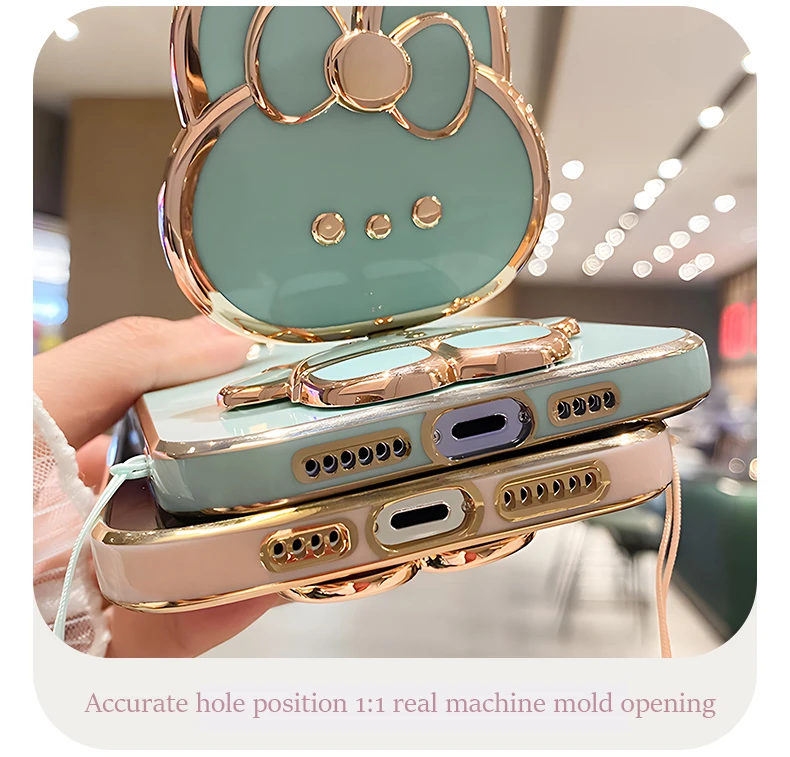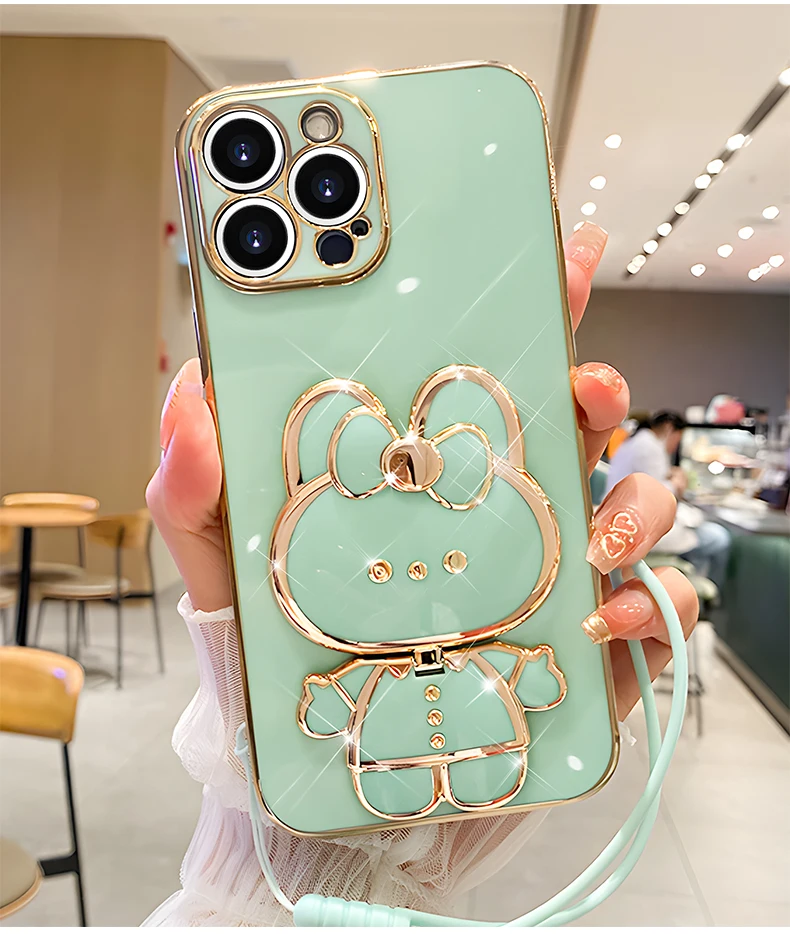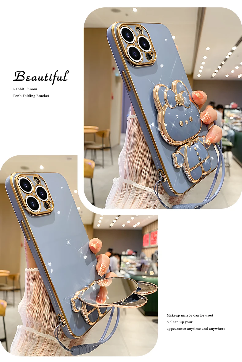 Mirror Rabbit Strap Plating Case For iPhone 14 11 12 13 Pro Max 13 12 Mini 11 12 13 14 7 6 6S Plus X Xr Xs Max SE 2020 Cover
